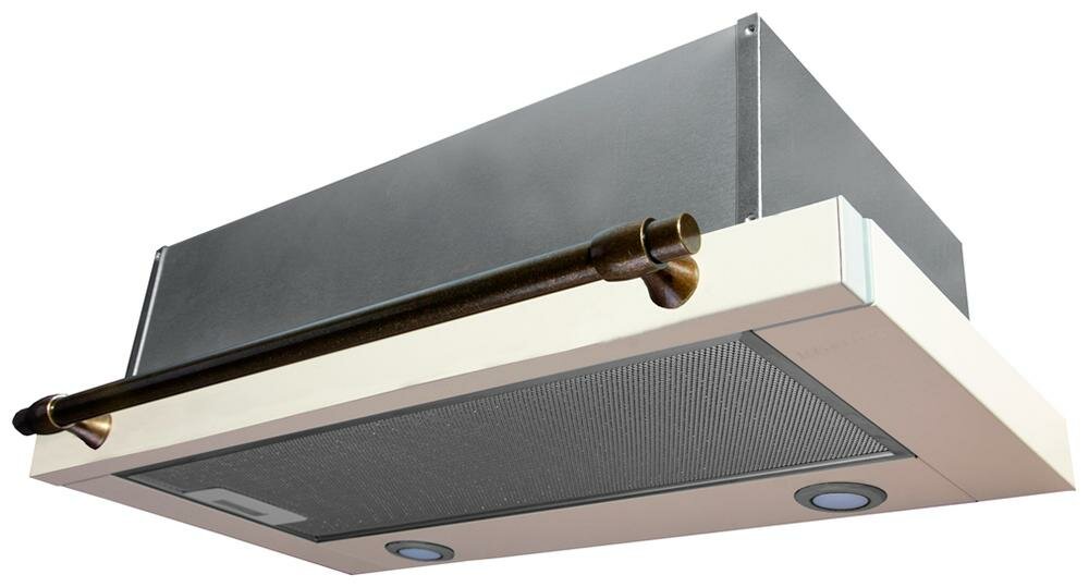 Вытяжки Korting/ "Встраиваемая вытяжка с выдвижным экраном в ретро дизайне,ширина 60 см, 3 режима, механическое управление, 650 м3/ч., алюминиевые жировые фильтры, LED освещениe - 2 лампы, ур.шума 57дб, рейлинг в цвете бронза, цвет - слоновая кость