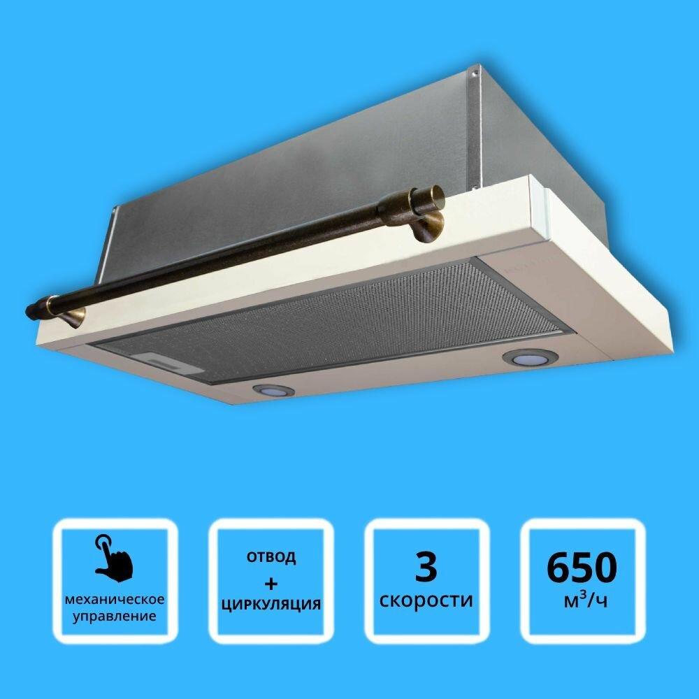 Вытяжки Korting/ "Встраиваемая вытяжка с выдвижным экраном в ретро дизайне,ширина 60 см, 3 режима, механическое управление, 650 м3/ч., алюминиевые жировые фильтры, LED освещениe - 2 лампы, ур.шума 57дб, рейлинг в цвете бронза, цвет - слоновая кость