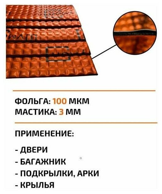 | Место применения | для пола / шумоизоляция / для капота / для багажника / для дверей / для потолка / для арок |