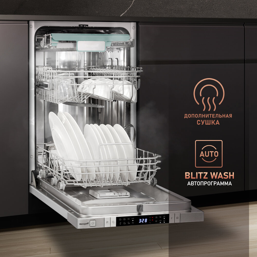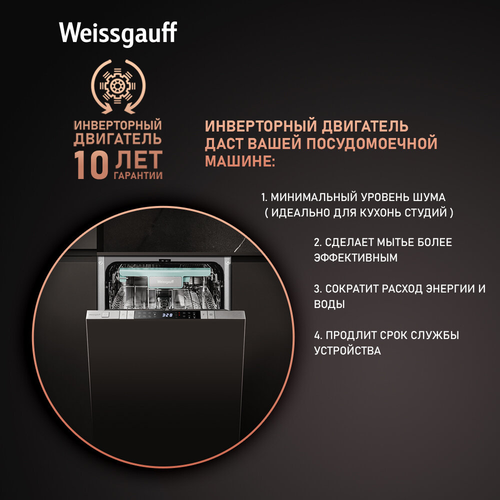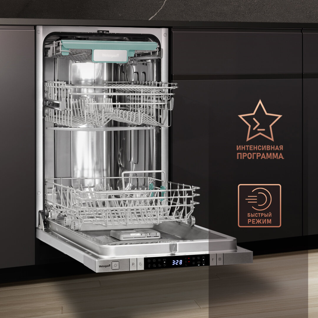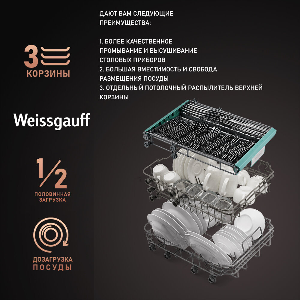 Умная встраиваемая посудомоечная машина с Wi-Fi, лучом на полу, авто-открыванием и инвертором Weissgauff BDW 4150 Touch DC Inverter Wi-Fi (модификация 2024 года),3 года гарантия, 3 корзины, 10 комплектов, 8 программ, полная защита от протечек