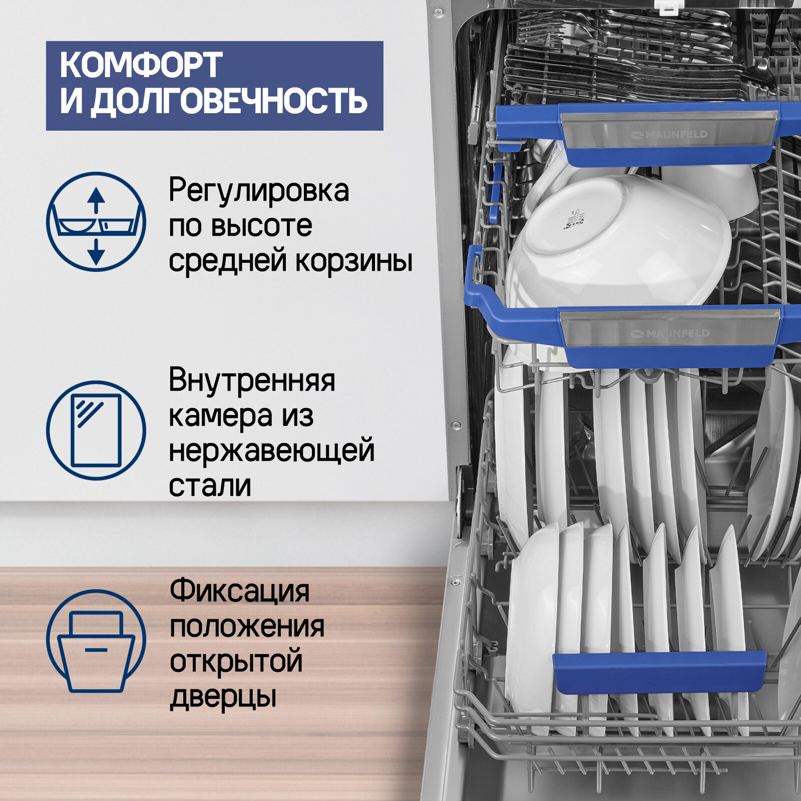 | Особенности конструкции | дисплей / использование средств 3 в 1 / регулируемая по высоте корзина для посуды / внутренняя поверхность из нержавеющей стали |