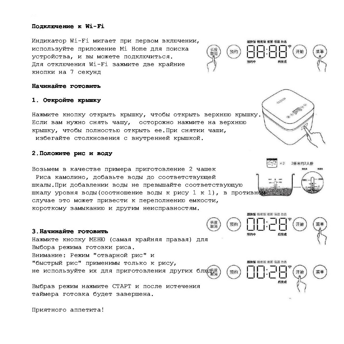 | Подробная комплектация | 1 х Рисоварка-мультиварка ,1 х мерный стаканчик ,1 х Чаша ,1 х шнур питания ,1 х переходник на евровилку и кладём распечатанный QR-код для перехода на русскую инструкцию |