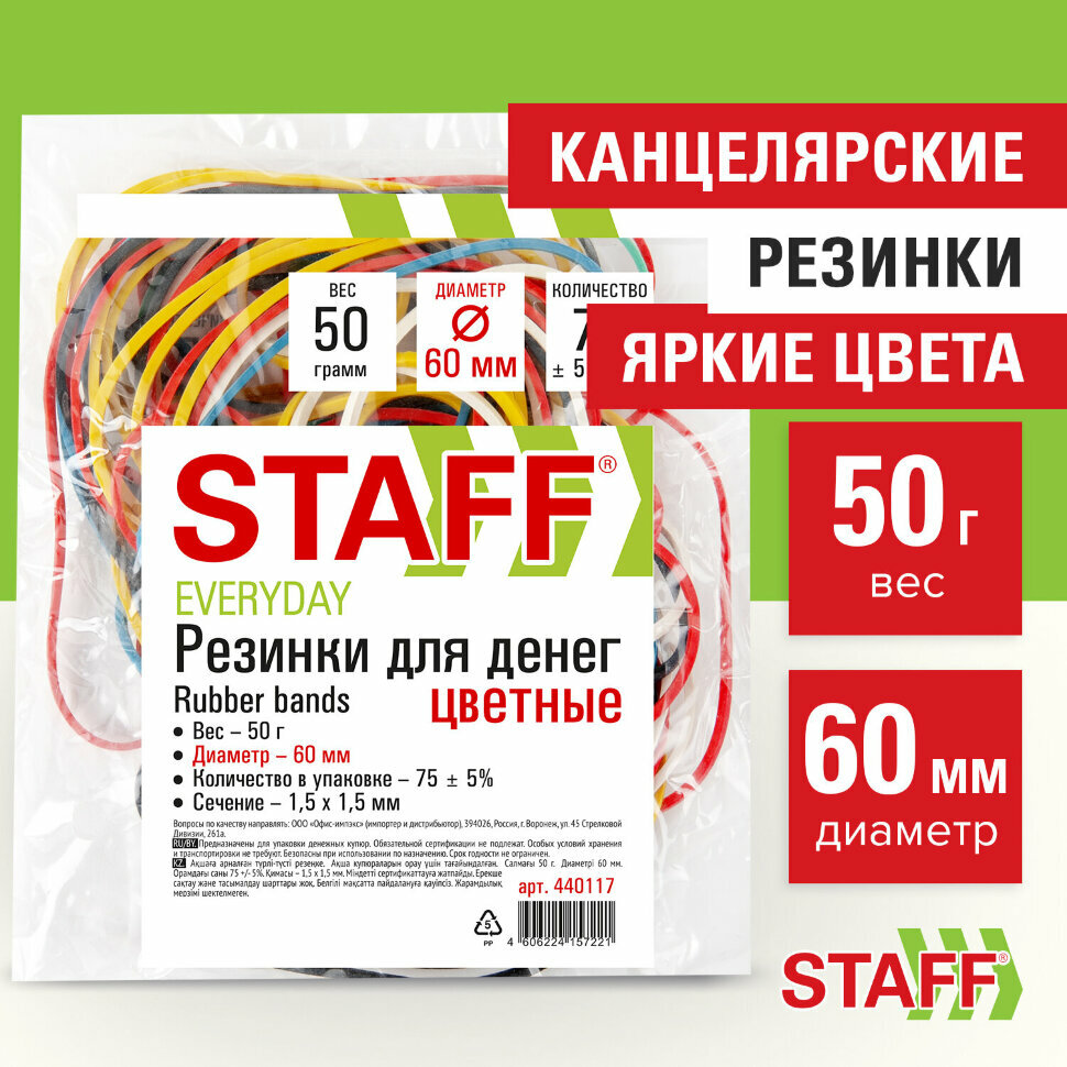 СохранитьРезинки Brauberg STAFF 50 г, банковские универсальные диаметром 60 мм, цветные, натуральный каучук, 440117 интересное: