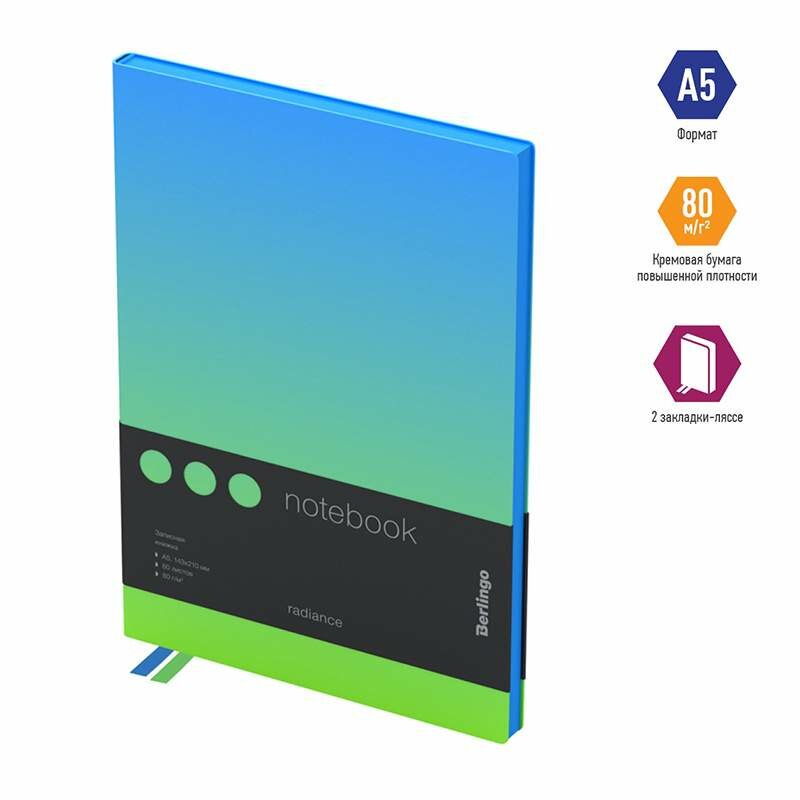 Записная книжка А5 Berlingo "Radiance", 80 листов, клетка, кожзам, черный срез, голубой/зеленый градиент (NB0_93503)