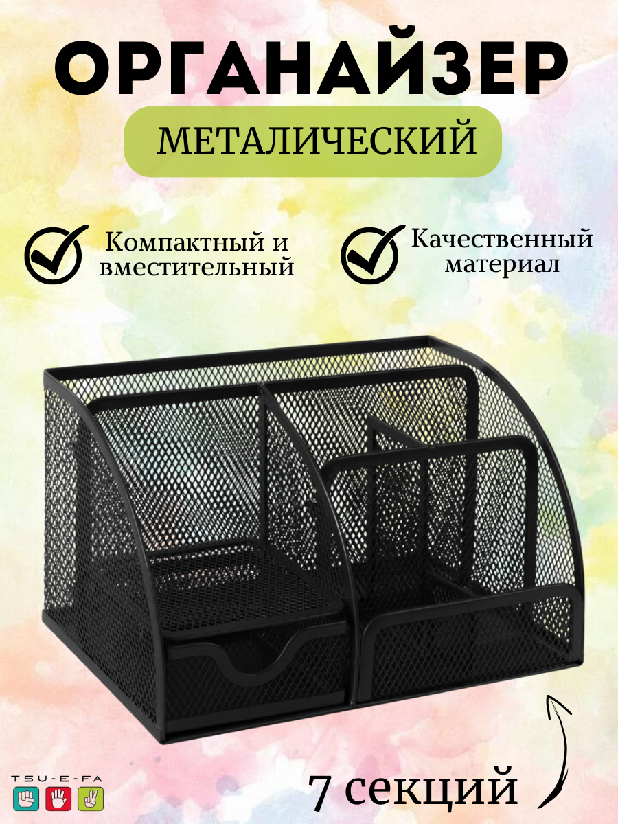 Подставка-органайзер для канцелярии настольная металлическая для ручек / карандашей офисная Brauberg, 7 секций, 125х220х140 мм, черная
