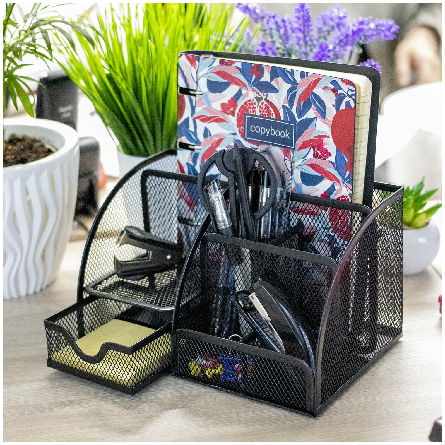| Плюсы: | Удобный органайзер с отсеками для бумажных блоков, крупной канцелярки, вмещаются даже блокноты. |