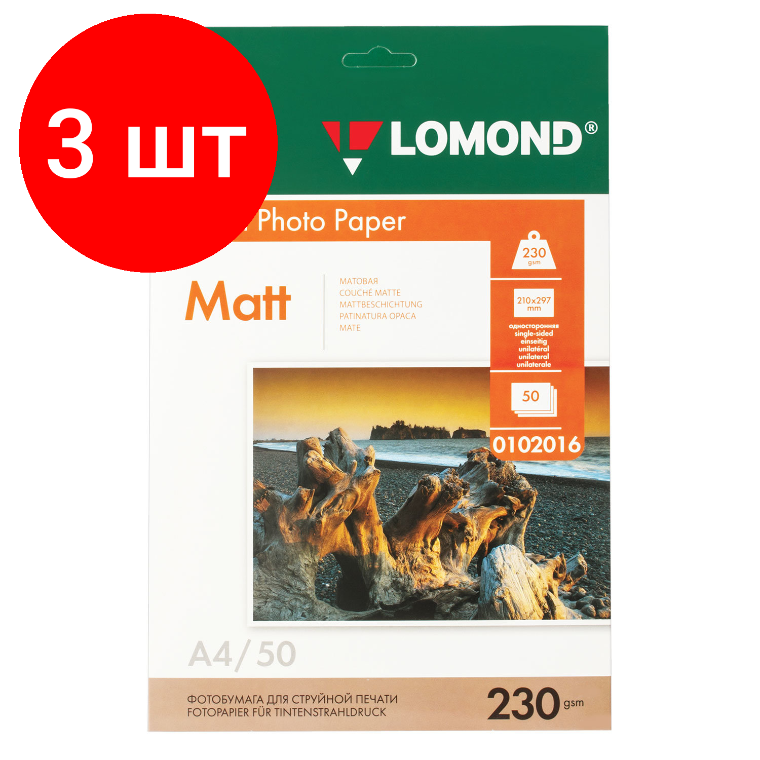 Купить Комплект 3 шт, Фотобумага А4, 230 г/м2, 50 листов, односторонняя, матовая, LOMOND, 0102016