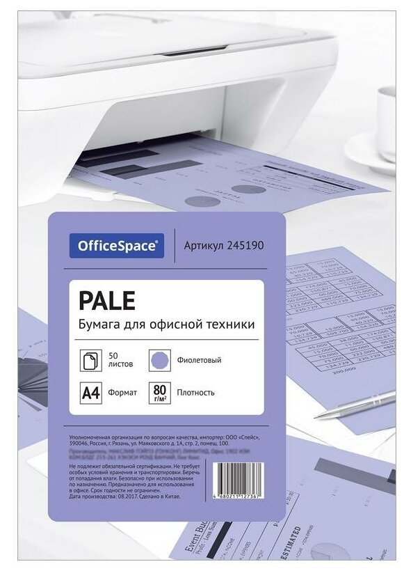 Бумага цветная OfficeSpace pale А4, 80г/м2, 50л. (фиолетовый) 245190 И 4680211127367