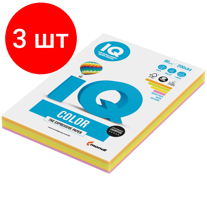 Купить Комплект 3 шт, Бумага IQ "Color Neon Mixed Packs" А4, 80г/м2, 200л. (4 цвета)