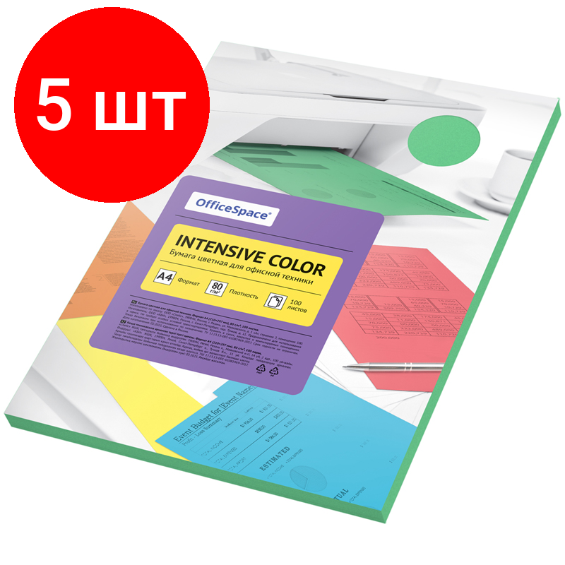 Купить Комплект 5 шт, Бумага цветная OfficeSpace "Intensive Color", А4, 80г/м2, 100л., (зеленый)