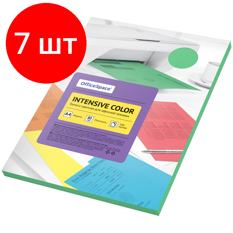Купить Комплект 7 шт, Бумага цветная OfficeSpace "Intensive Color", А4, 80г/м2, 100л., (зеленый)