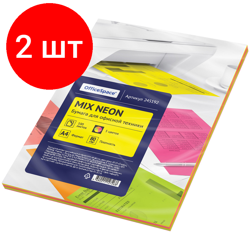 Купить Комплект 2 шт, Бумага цветная OfficeSpace neon mix А4, 80г/м2, 100л. (5 цветов)