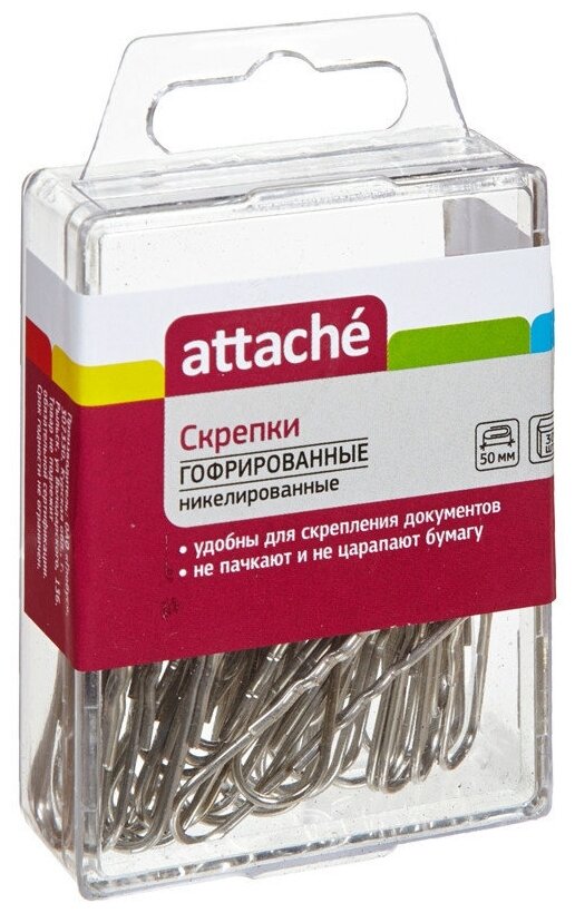 Скрепки Attache 50 мм, никелированные, гофрированные, 30 штук