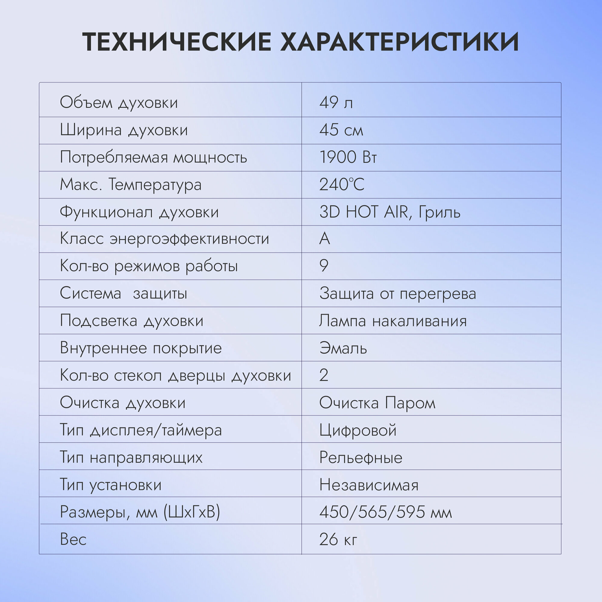 Духовой шкаф электрический встраиваемый 45см белый / 9 режимов (гриль + конвекция) / DELVENTO V4EW59001 / дисплей / таймер 90 мин, часы / двойное стекло LOW-E / хром. решетка и 2 противня: стандартный + круглый / подсветка / гарантия 3 года /
