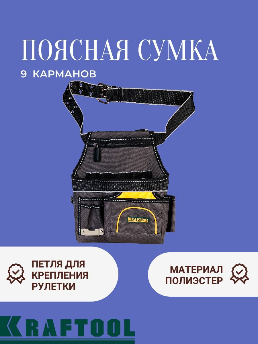 Сумка KRAFTOOL INDUSTRIE поясная с ремнем, 9 карманов, петля для крепления рулетки