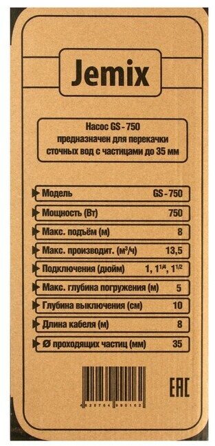Насос дренажно-фекальный, Jemix, 8 м, 750 Вт, погруж5 м, напор8 м, 13.5 м³/ч, с защитой, GS-750