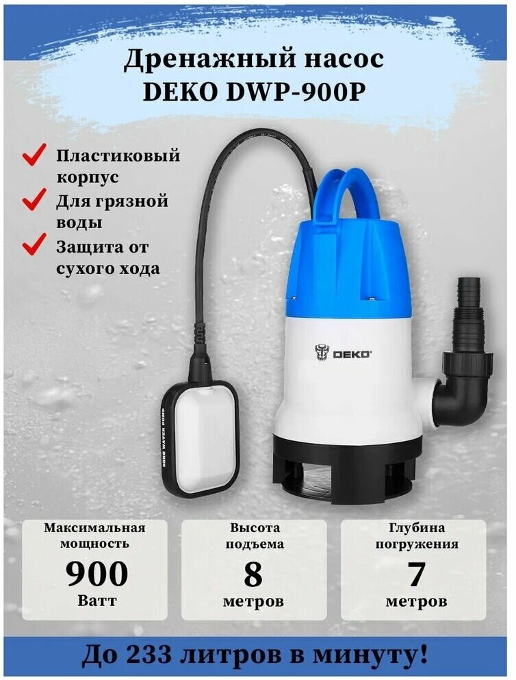 Насос дренажный DEKO DWP-950P PLUS (грязевая, 2 режима, 220В, 950Вт, пластик)