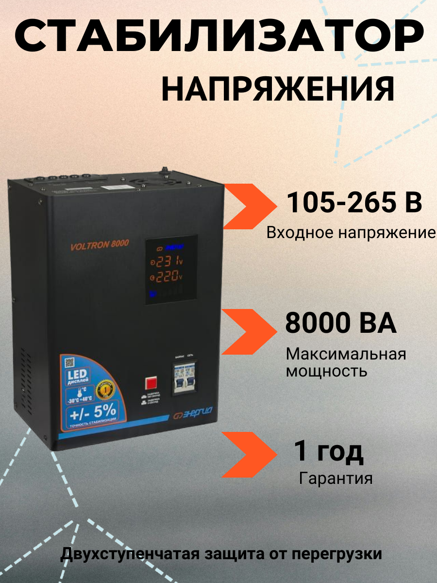 Стабилизатор Энергия Voltron 8000 по точности: 105-265В по защите: 95-280В Е0101-0159 .
