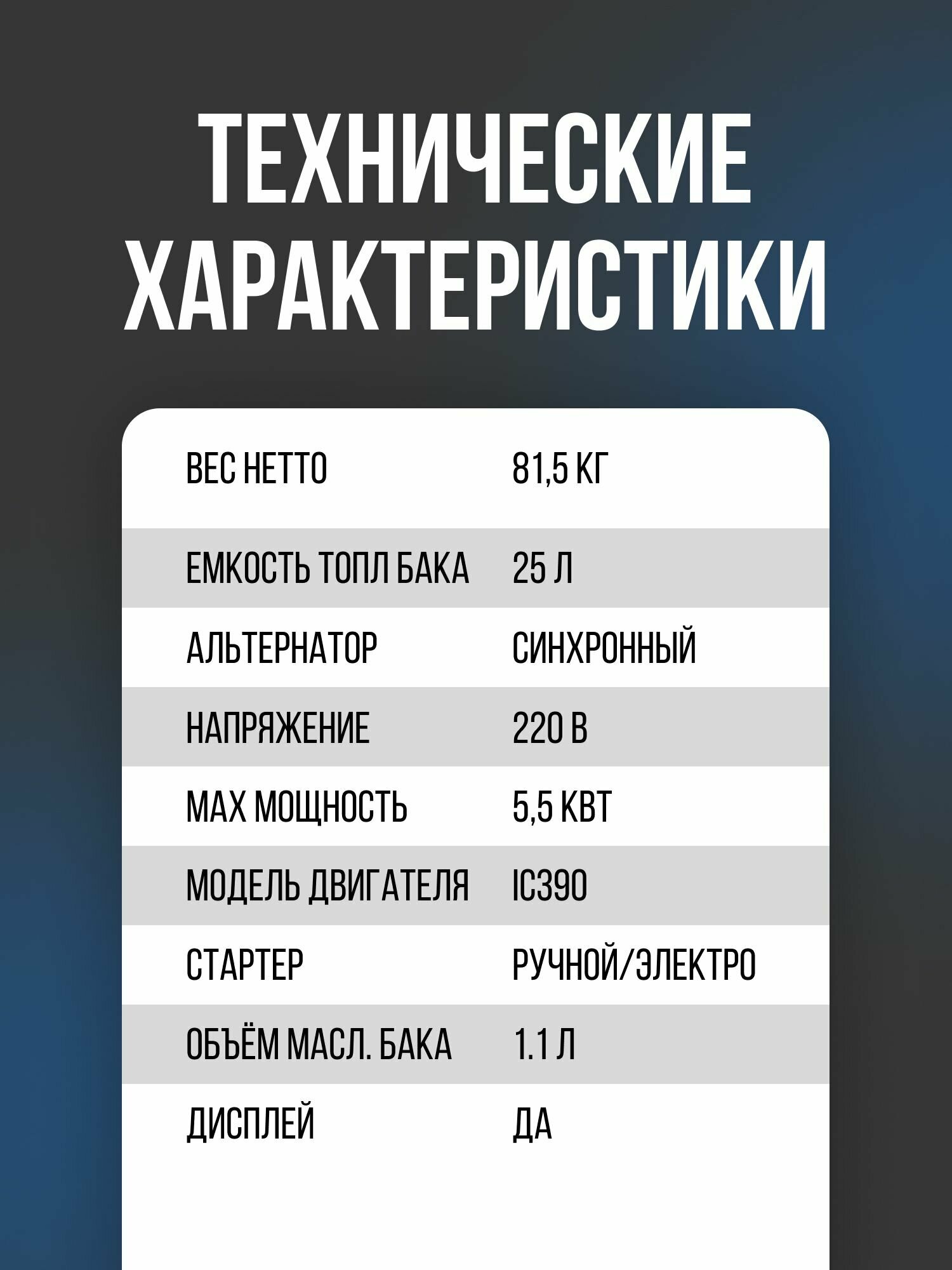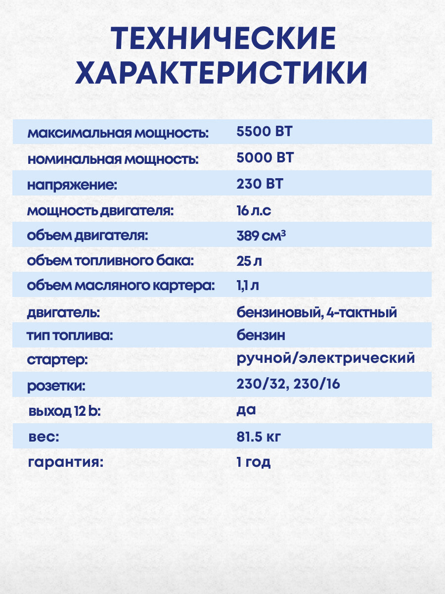| Дополнительная информация | комплектация: генератор, руководство пользователя, гарантийный талон, упаковка; объем картера 1.1 л, автоматический регулятор напряжения, розетки 1*16A, 1*32A, коэффициент мощности Cos ф 1, максимальный ток вывода 12 В - 8.3 А |