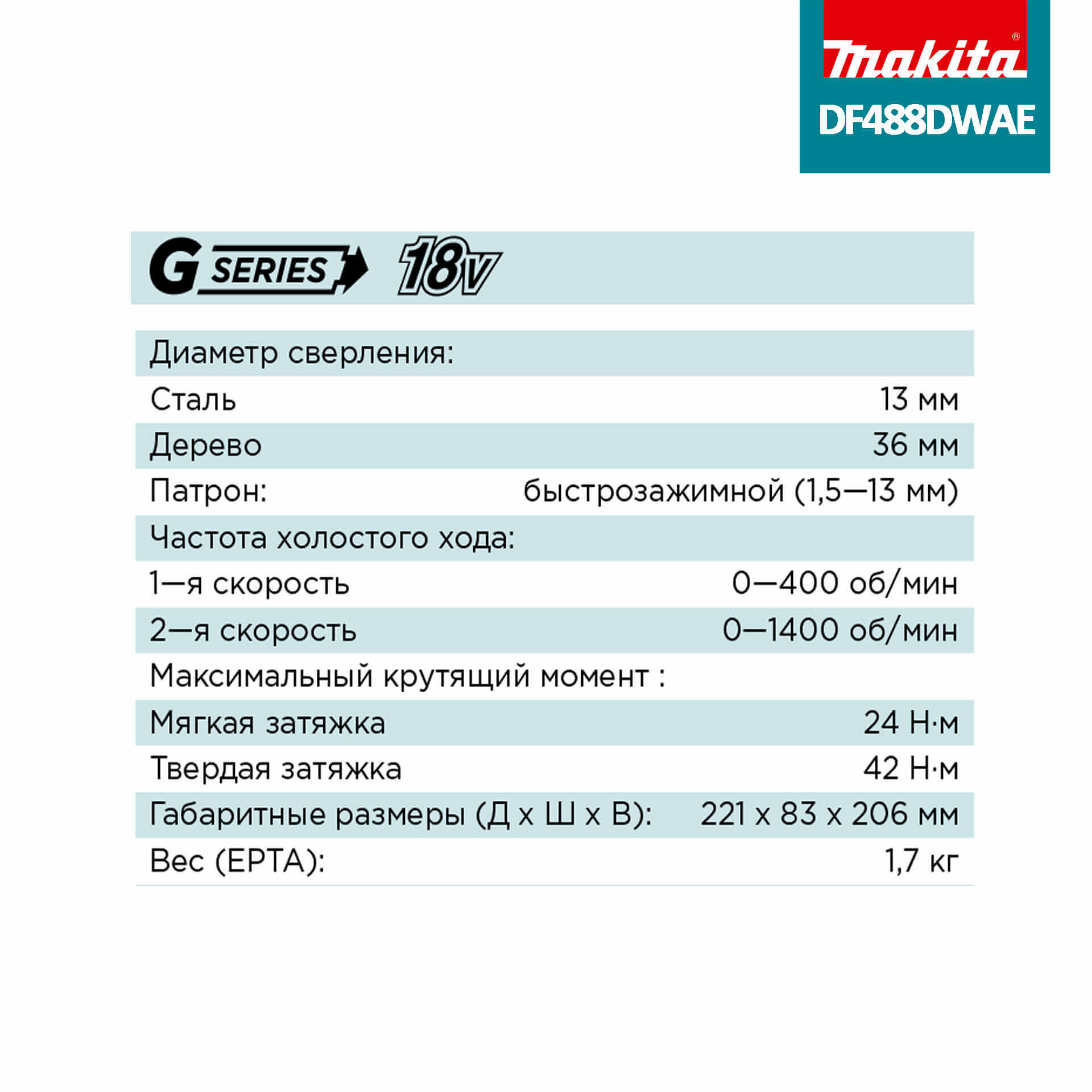 Makita DF488DWAE Дрель-шуруповерт аккум. G-серия 18В, 13мм, 42/24Нм (2х2.0Ач, з/у)
