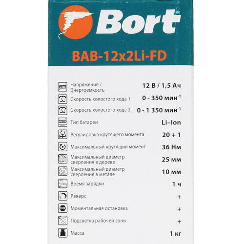 Дрель-шуруповерт Bort Bab-12x2li-fd (2X1,5 AH) 93413151 аккумуляторная .