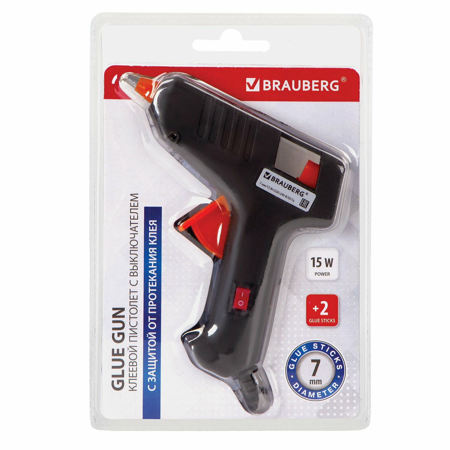 Клеевой пистолет 15 Вт для стержня 7 мм, с выключателем, BRAUBERG, в блистере, 671051