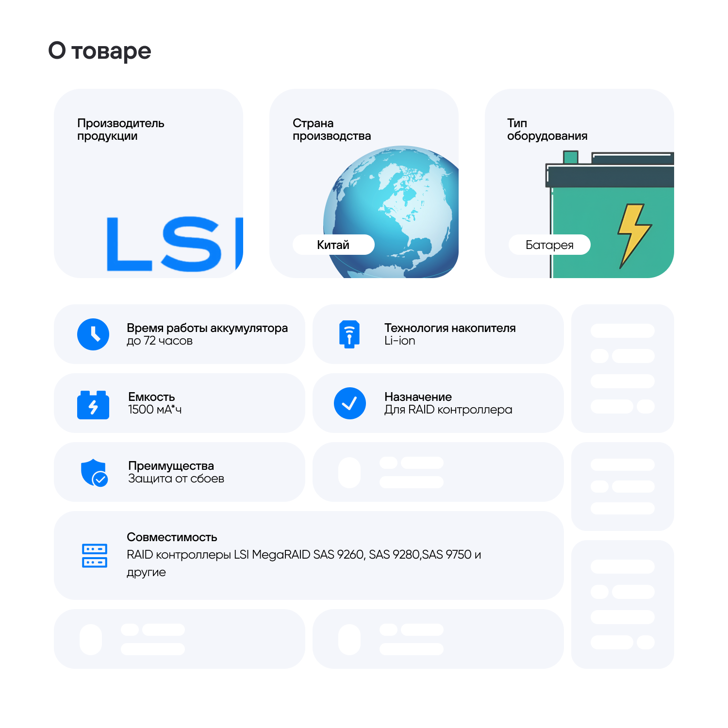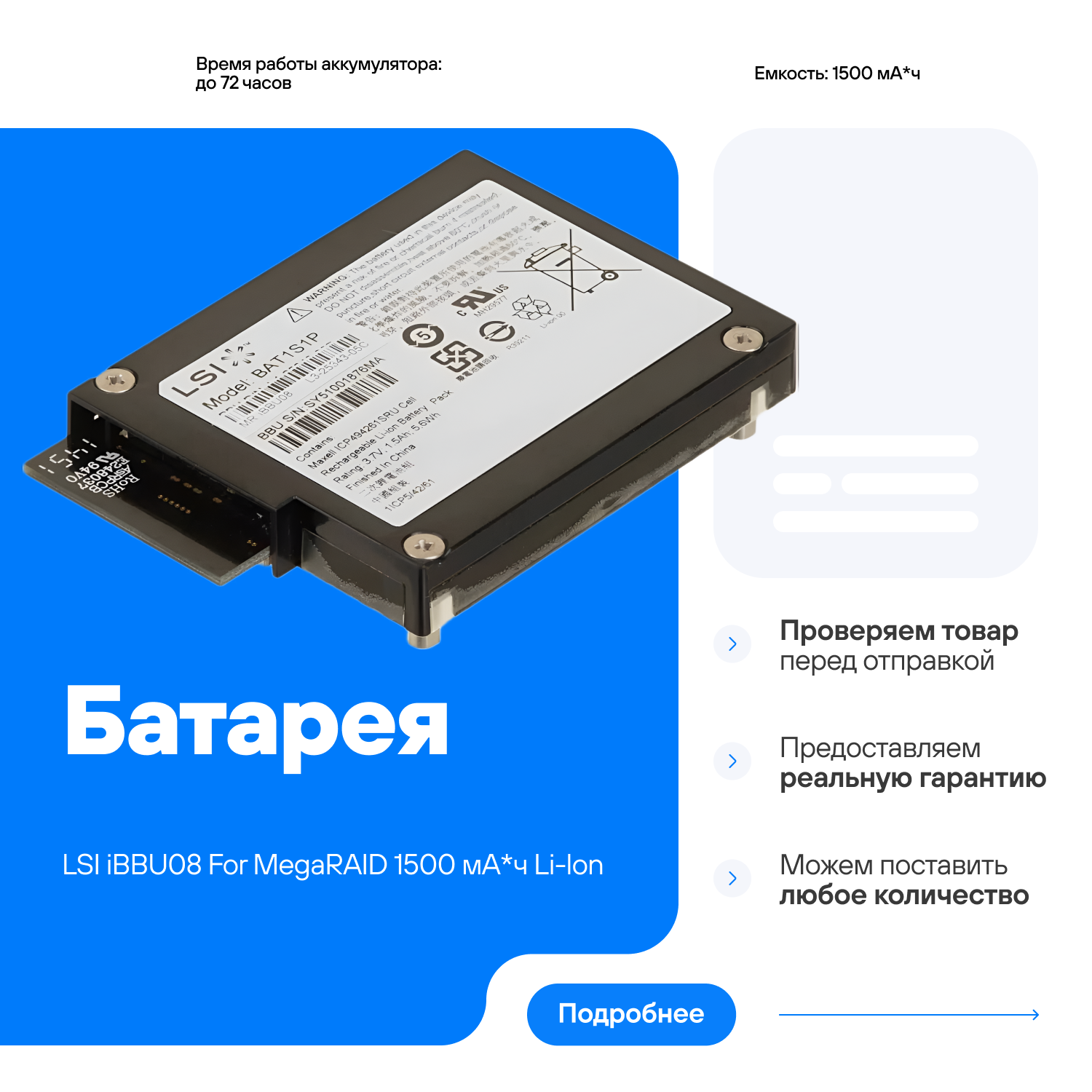 СохранитьБатарея LSI iBBU08 For MegaRAID 1500 мА*ч Li-Ion LSIIBBU08 LSI00264 L5-25343-06 аналог IBM 81Y4451 81Y4419 интересное: