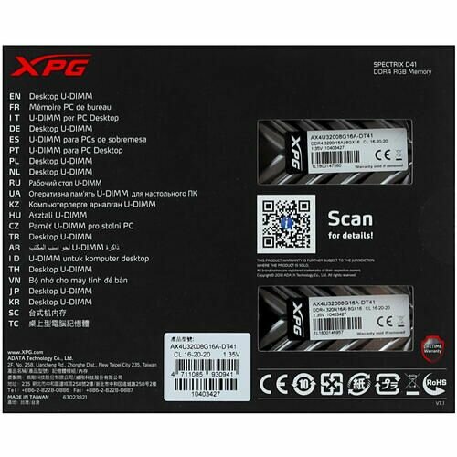 Оперативная память XPG Spectrix D41 16 ГБ (8 ГБ x 2) DDR4 3200 МГц DIMM CL16 AX4U32008G16A-DT41