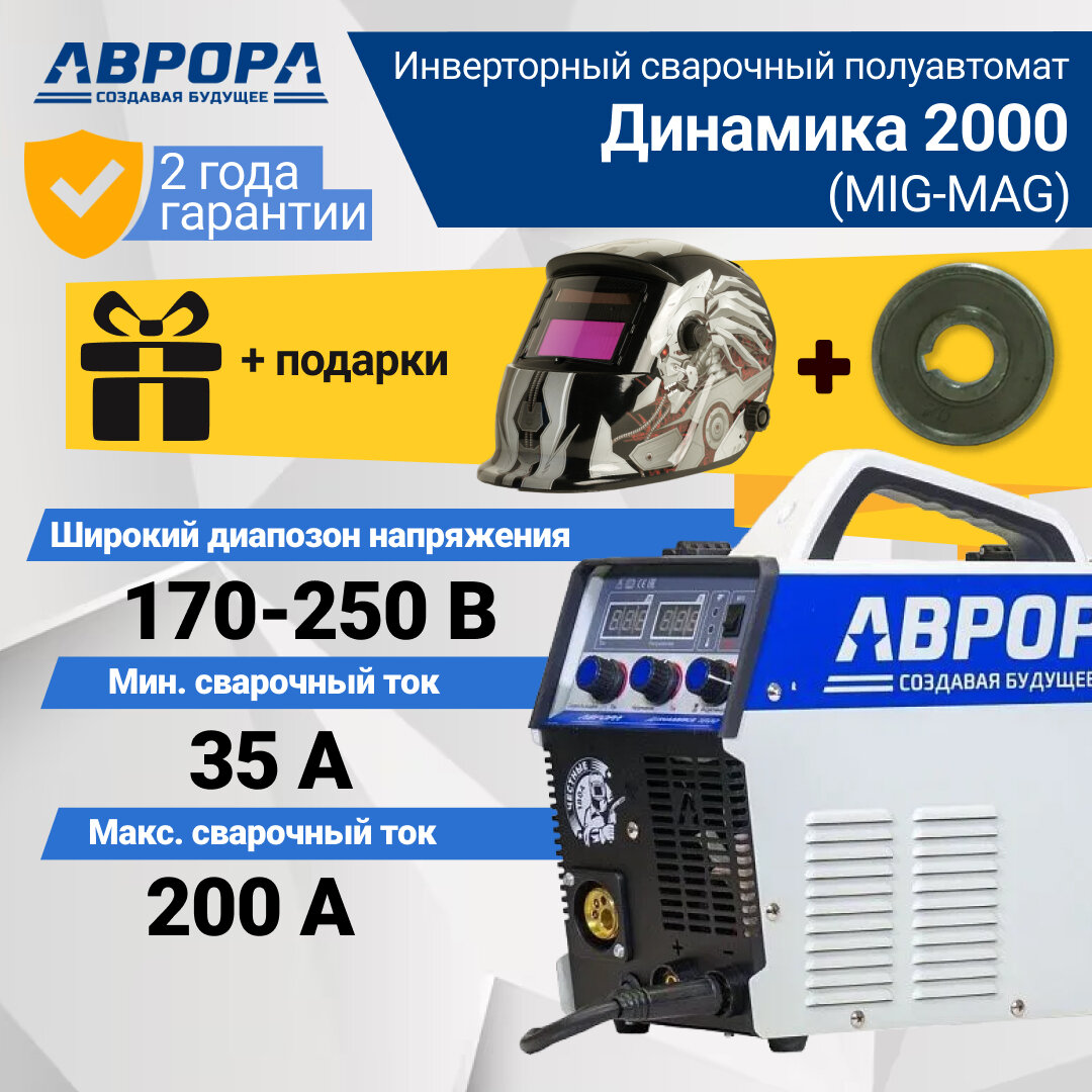 Сварочный аппарат инверторного типа Aurora Динамика 2000, MMA, MIG/MAG (72229079) + Подарок Маска Хамелеон Aurora A-777 Carbon и Ролик порошк. 0.8-0.9 мм