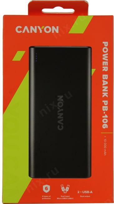 Внешний аккумулятор Canyon PB-106 с дополнительный входом Type-C 10000 мАч черный CNE-CPB1006B