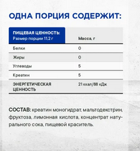 | Дополнительная информация | Для наилучших результатов употреблять со сладкими напитками без кофеина; энергетическая ценность на 100 г: 21 ккал; рекомендации по применению: курс приема длится 1-2 месяца; после необходимо сделать перерыв 3-4 недели; в первые 7 дней добавку принимать по 5 грамм 4 раза в день между едой; после недели креатин пить по 5 грамм утром и перед тренировкой; для приготовления смешайте одну мерную ложку порошка с 200-300 мл сока или воды; состав: креатин моногидрат, мальтодекстрин, фруктоза, лимонная кислота, концентрат натурального сока, пищевой краситель |