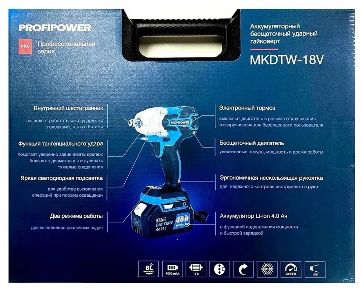 Гайковерт бесщеточный ударный ProfiPower MKDTW-18B (Li-ion-2шт, 4.0Ач, 330Нм,ударная головка,З/У в кейсе)