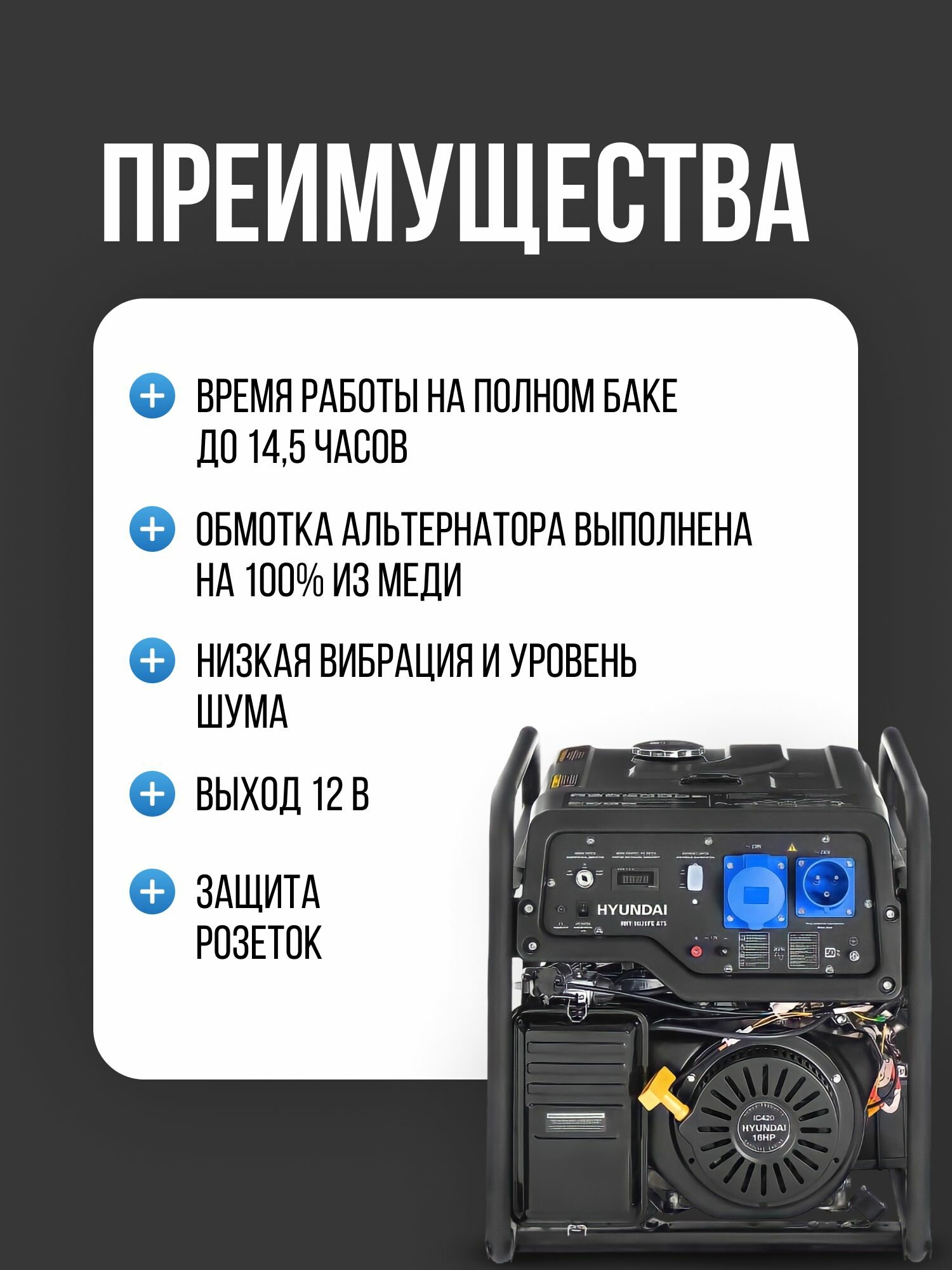 | Минусы: | Не запускайте генератор при включенном потребителе. |