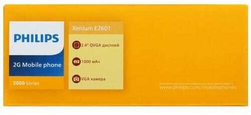 | Комплектация | мобильный телефон Philips Xenium E2601, аккумуляторная батарея, зарядное устройство, документация |