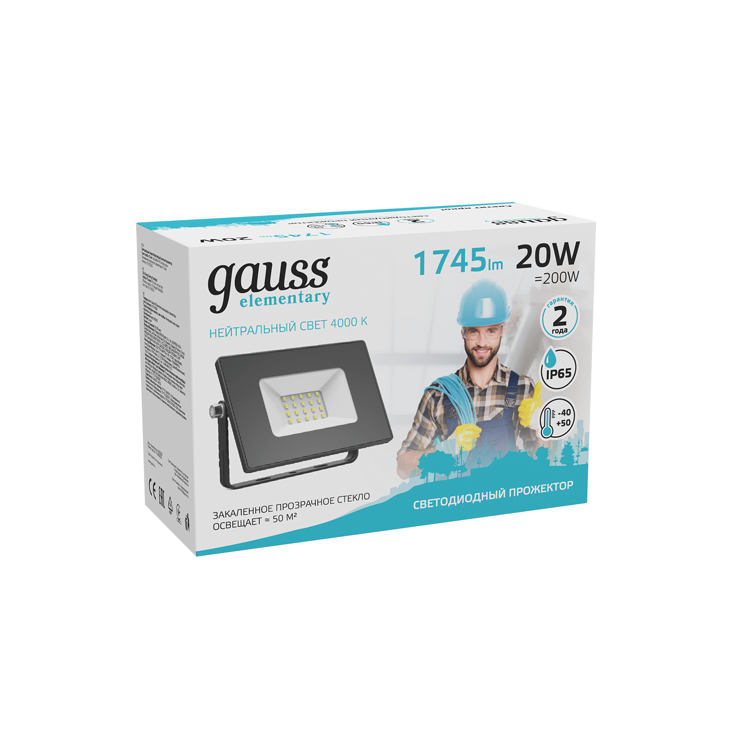 Прожектор Gauss Elementary 20W 1745lm 4000К 200-240V IP65 черный LED