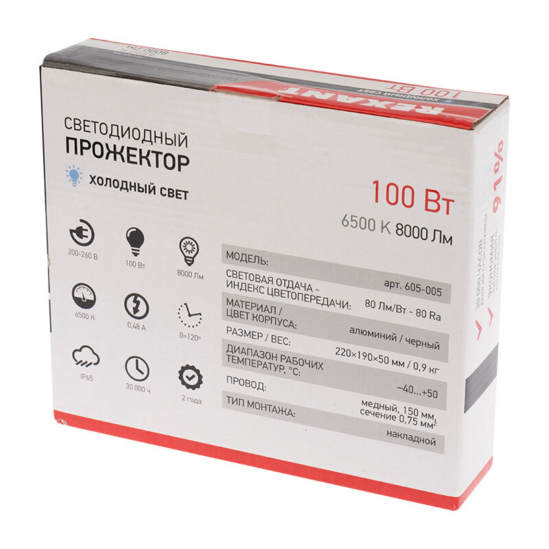 Прожектор светодиодный (100 Вт 200–260В IP65 8000 лм 6500 K) арт.605-005 Rexant 182511