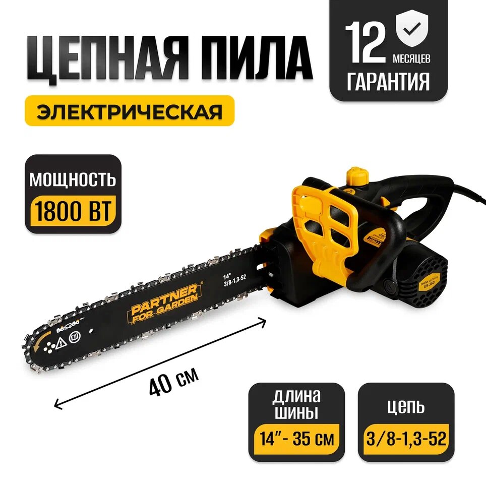 СохранитьПила цепная электрическая для сада / Электропила PARTNER FOR GARDEN ES-350P ( 1800 Вт, 14" / 35 см шина, цепь 3/8-1,3-52, 52 звеньев, 220 В ) интересное: