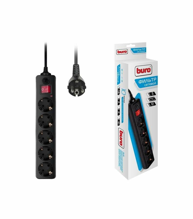 Купить Удлинитель с сетевым фильтром 5х1.8м с заземл. 10А IP20 500SH-1.8-W CCA 3х0.75 черн. BURO 992289 (10шт.в упак.)