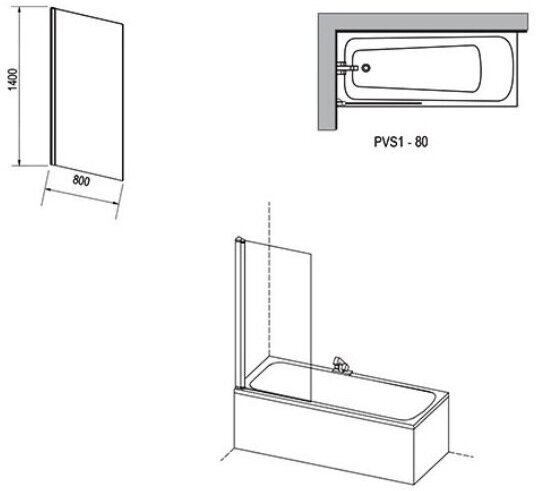 Перегородка (шторка, ширма) на борт ванны неподвижная Ravak PVS1-80 профиль черный, прозрачное стекло 79840300Z1 00000069011