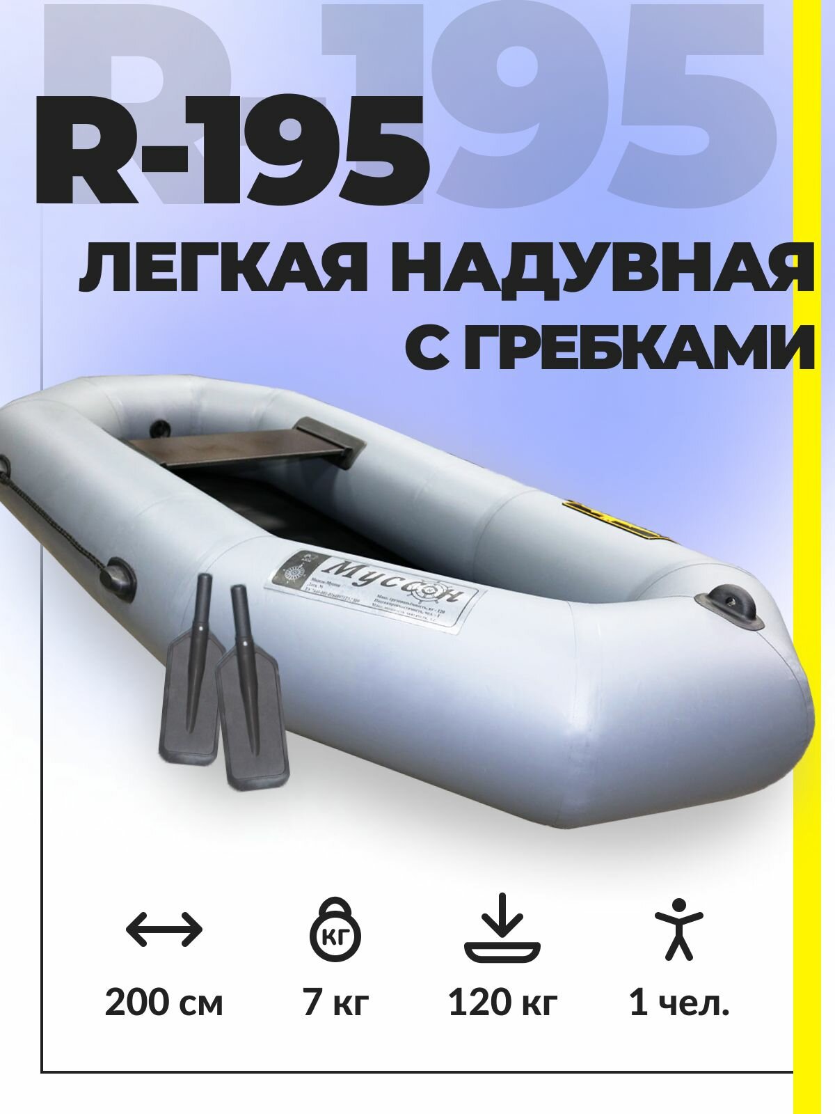 Лодка надувная для рыбалки ПВХ Муссон R-195 ГР (с гребками) гребная одноместная, серая