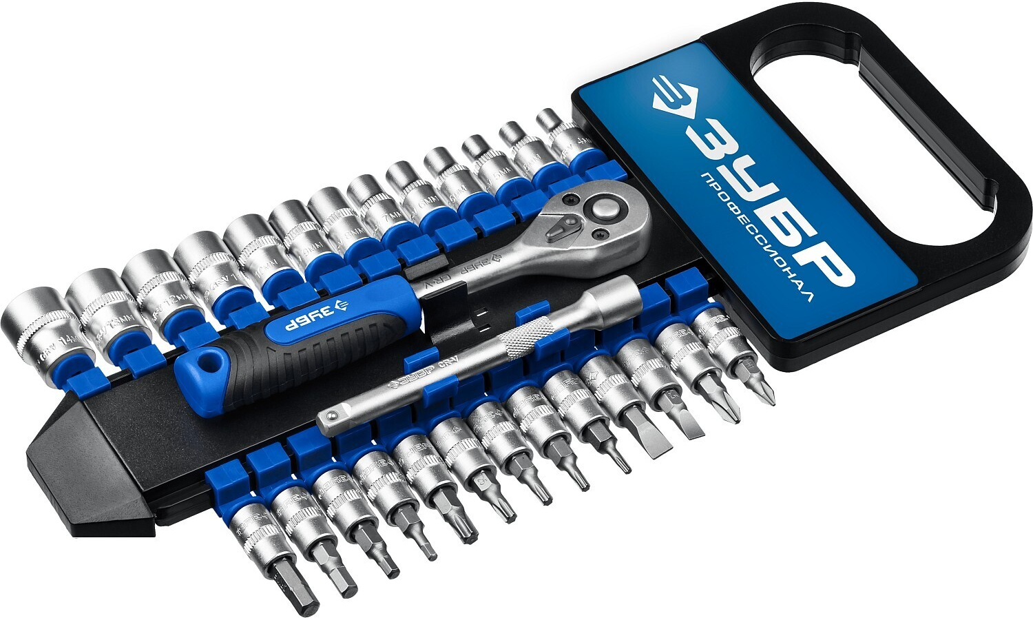 Набор торцовых головок ЗУБР биты 1/4 4-14мм 28 предметов