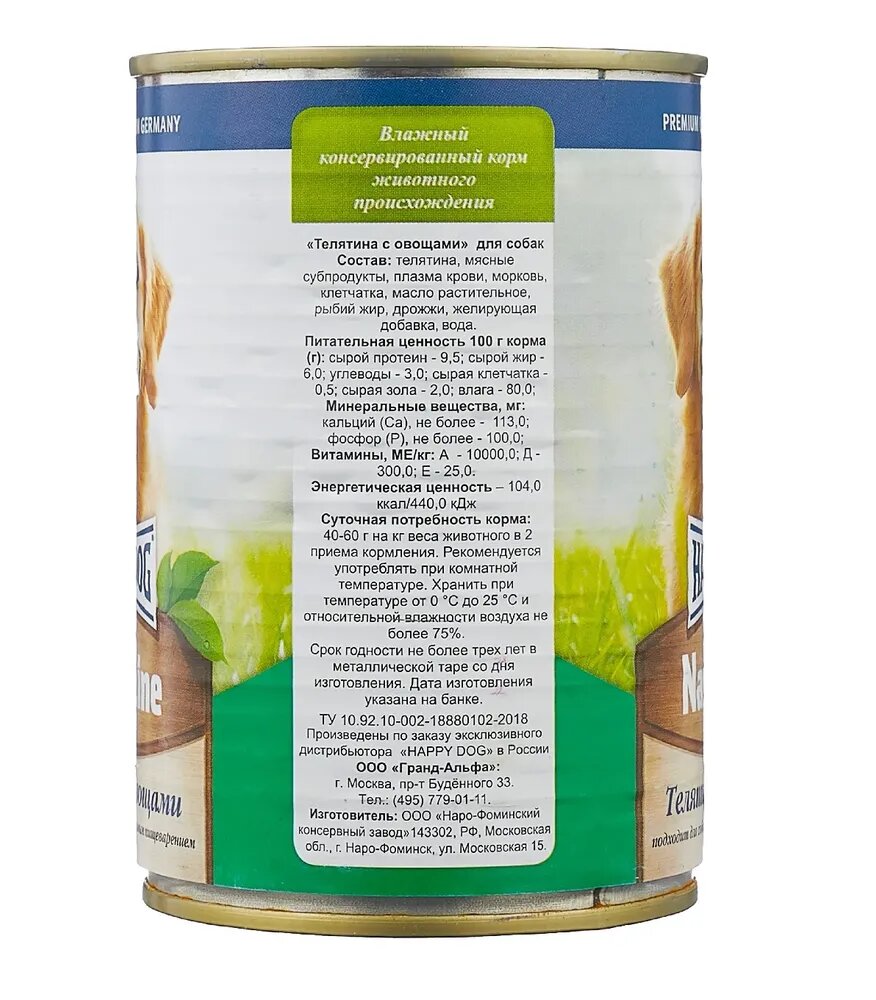 Упаковка банок HAPPY DOG для собак Телятина с овощами нфкз (400гр x 20шт)