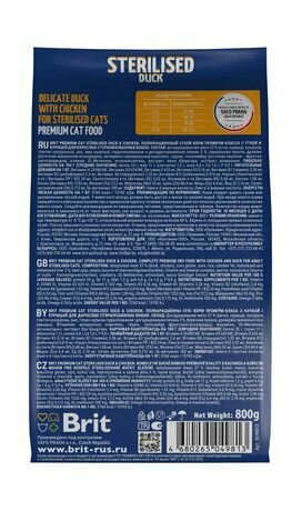 Корм BRIT 800гр для стерилизованных кошек с уткой и курицей Premium Cat Sterilized