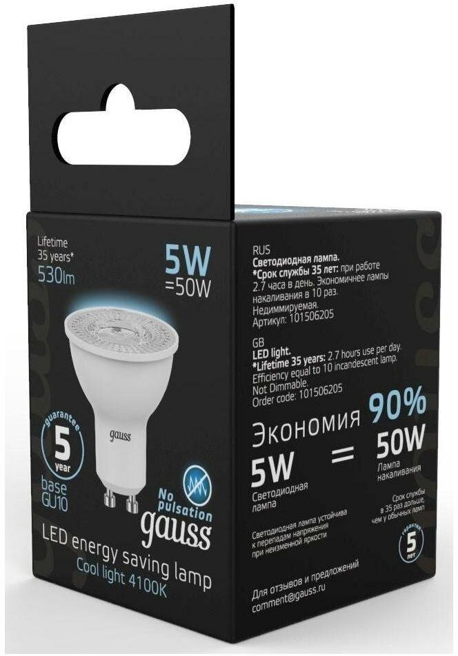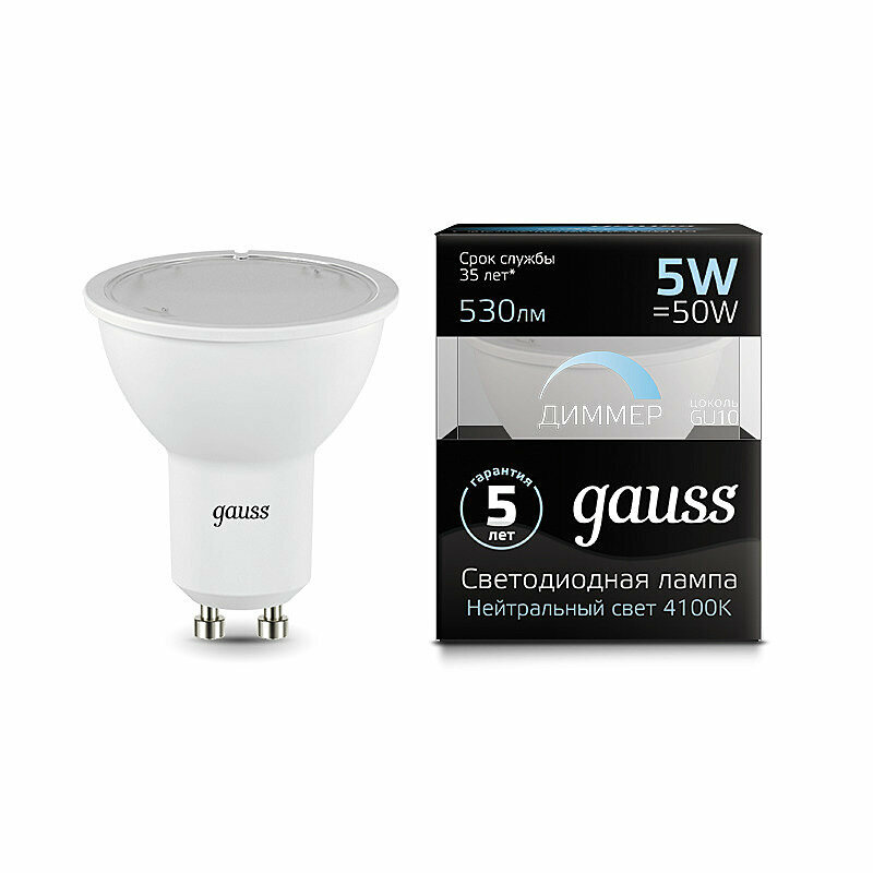 10шт/уп. Лампа LED Спот 5Вт 230B MR16 GU10 530Лм 4100К Свет Нейтральный белый арт. 101506205 Gauss, уп. 10шт