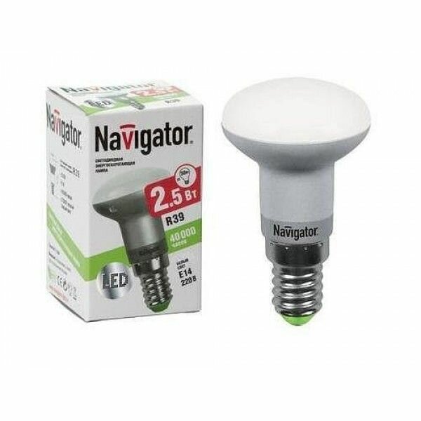 (14 шт.) Светодиодная лампочка Navigator R39 гриб, мощность 2.5 Вт, напряжение питания 220 В, цветовая температура 4000K, нейтральный белый свет, световой поток 200 Лм, цоколь E14, размер 39х67 мм