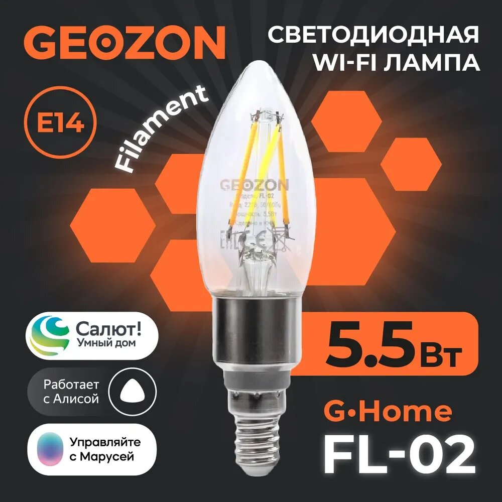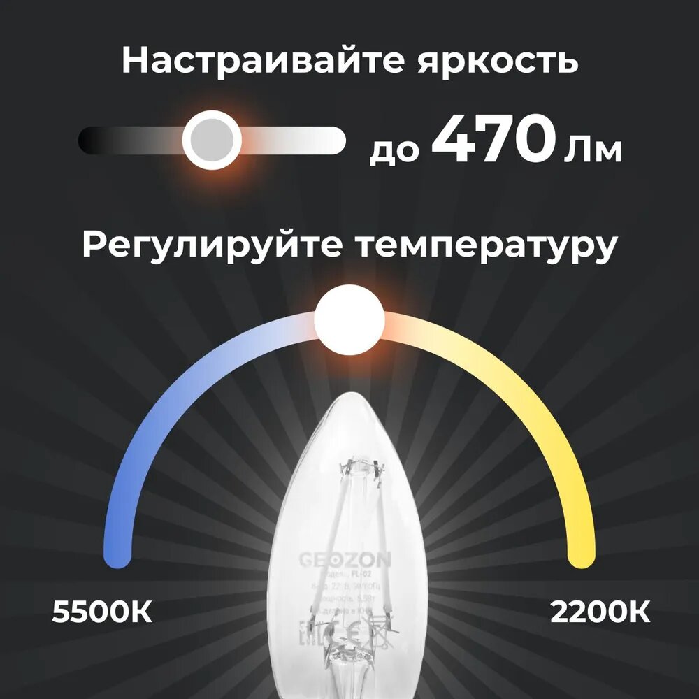 Умная LED лампа филамент GEOZON GSH-SLF02 E14, C35, 5.5W, 2200K-5500K, Wi-Fi, AC 220-250В, 50-60Гц, 470lm, прозрачная