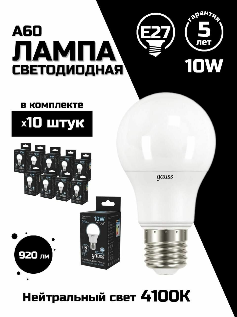 Лампа Gauss A60 10W 920lm 4100K E27 LED 102502210 (10 шт)