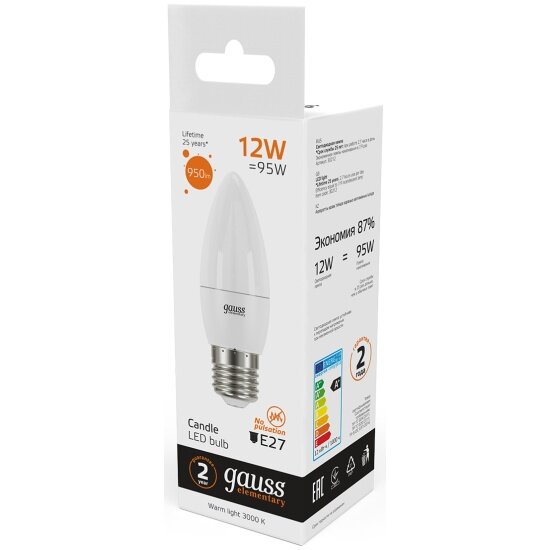 Ниже Вы можете прочитать отзывы на Светодиодная лампа Gauss Elementary Свеча 12W 950lm 3000K E27 LED 1/10/100, ознакомится с подробными характеристиками, посмотреть интересные обзоры и фотографии на Светодиодная лампа Gauss Elementary Свеча 12W 950lm 3000K E27 LED 1/10/100.