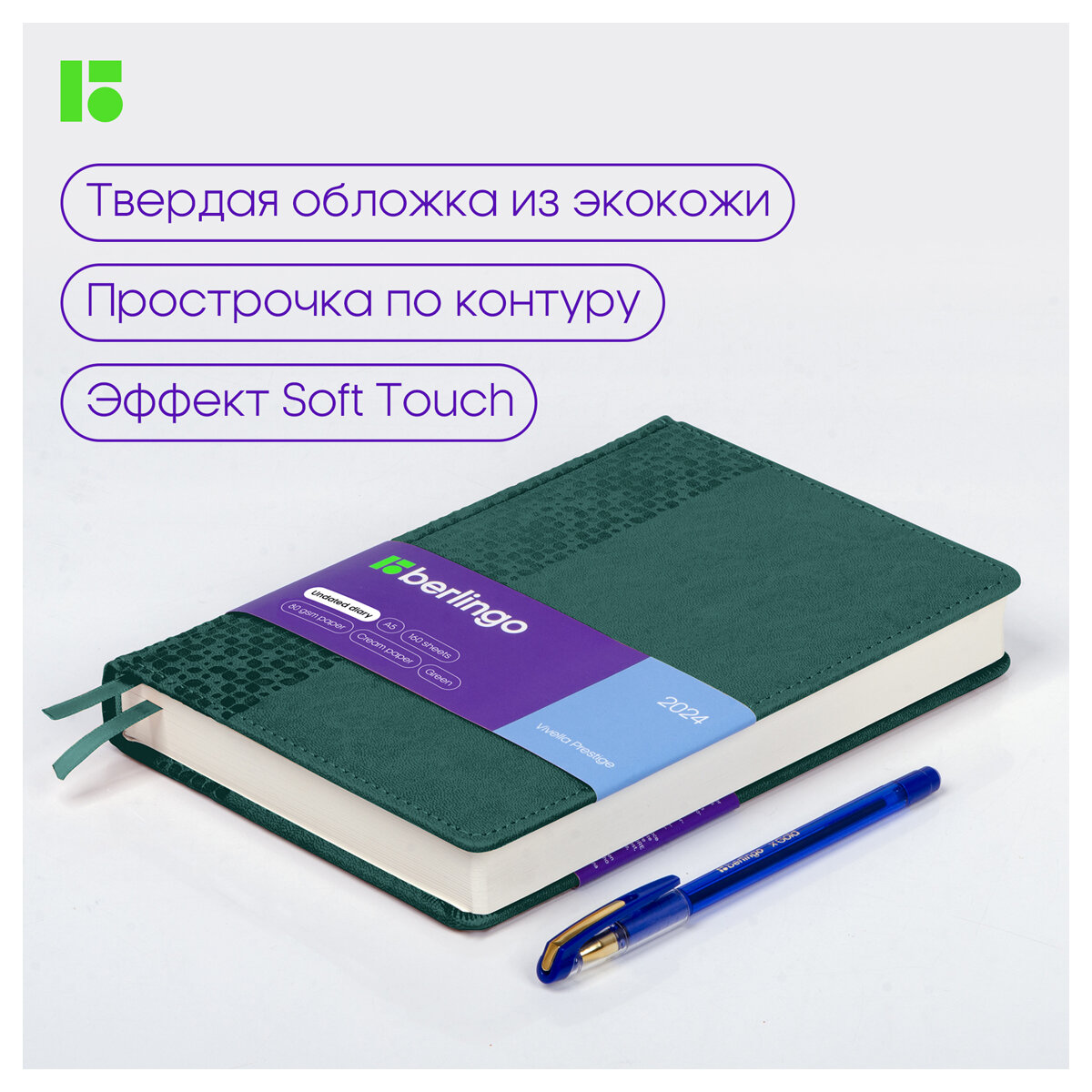 Ежедневник недатированный, A5, 160л., кожзам, Berlingo "Vivella Prestige", зеленый, 1 шт