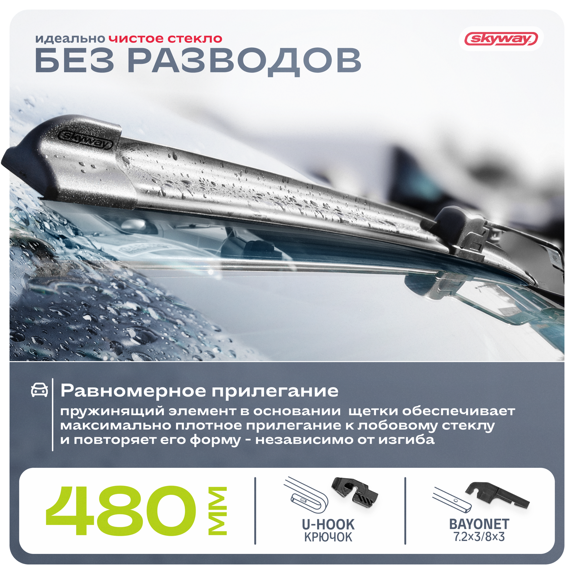 Щетка стеклоочистителя бескаркасная SKYWAY 480 мм, крючок (Hook), штык (Bayonet) S02701036